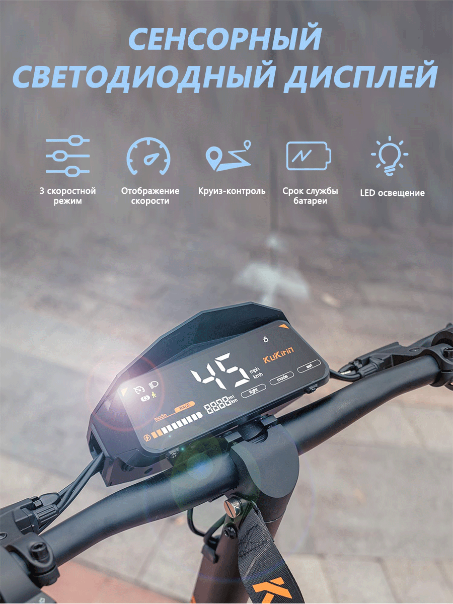 Мощные передние фары и ходовые огни обеспечивают отличную видимость в темное время суток, делая самокат заметным для других участников движения. Светодиодная светотехника питается от основной батареи и не требует замены элементов питания. Регулируемые режимы езды позволяют адаптировать поведение самоката под конкретные условия — от экономичного до максимально динамичного.