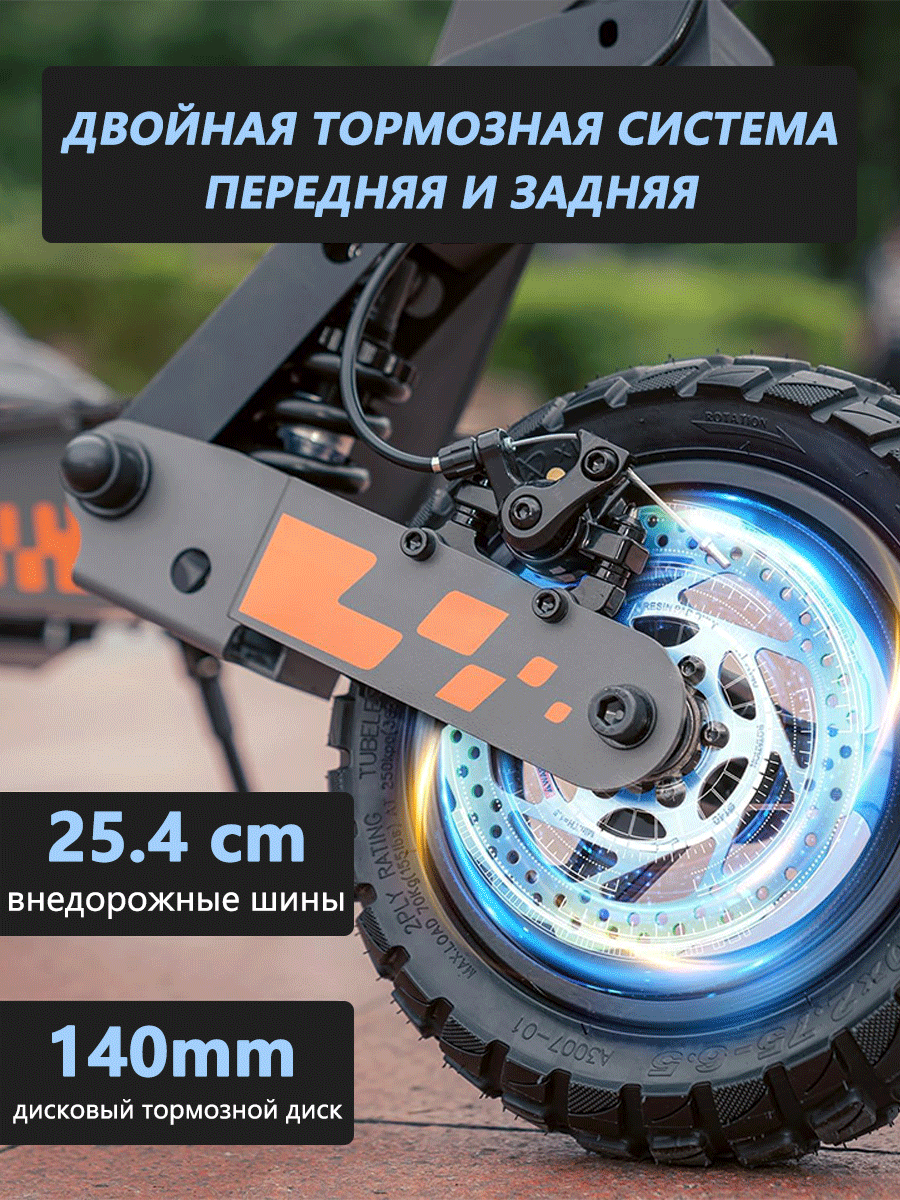 Колеса диаметром 10 дюймов с качественными покрышками обеспечивают отличную устойчивость и комфортное преодоление дорожных неровностей. Степень защиты IP54 гарантирует надежную работу электронных компонентов при попадании пыли и брызг воды, что позволяет использовать самокат в различных погодных условиях. Максимальная нагрузка составляет 120 кг, подходя для большинства пользователей.