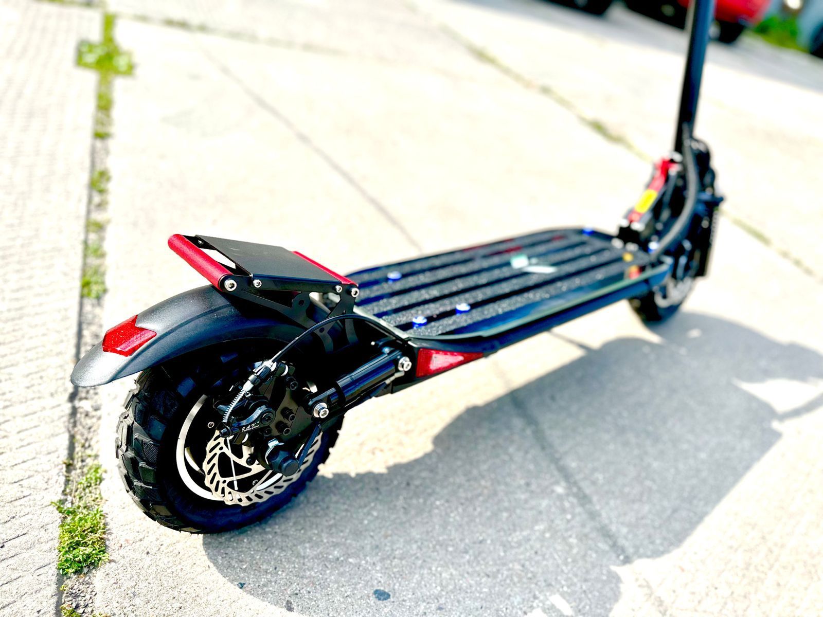 Мотор самоката Сициба Мангуст имеет мощность 1000 ватт и позволяет развивать скорость до 55 километров в час, а аккумуляторная батарея емкостью 20 ампер-часов даст возможность проехать до 65 километров без остановки. Заряжается батарея до 100% всего за 8 часов. Весит электросамокат 28.6 килограмма, а максимальная нагрузка, которую он способен выдержать – до 120 кг. Передний и задний амортизаторы отлично сглаживают все неровности дорожного покрытия, делая поездку максимально мягкой и комфортной. Колеса диаметром 10 дюймов имеют глубокий протектор, за счет которого в разы повышается сцепление с трассой – самокат без труда проедет как по скользкому асфальту, так и по песку, гравию и траве.