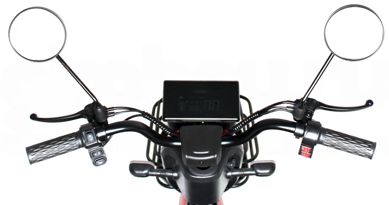 Электроскутер выполнен из прочной стальной рамы, что обеспечивает его долговечность и надежность. Цифровой бортовой компьютер предоставляет пользователю всю необходимую информацию, такую как скорость, уровень заряда, пробег и вольтаж аккумулятора, что делает управление более информативным и удобным. Съемный аккумулятор позволяет легко заменять его при необходимости, что добавляет удобства в использовании.
