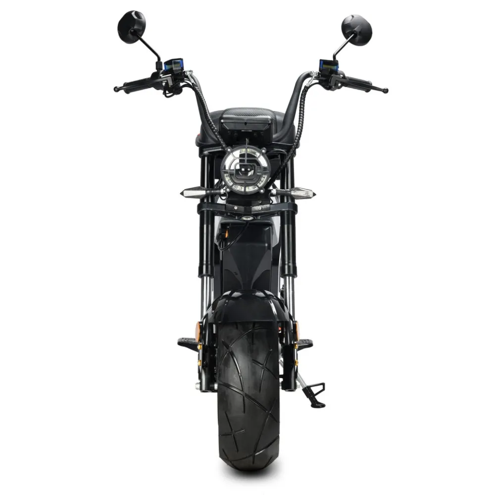 Стальная рама обеспечивает высокую жесткость конструкции и способность выдерживать значительные эксплуатационные нагрузки. Вес скутера составляет 40 кг, что обеспечивает устойчивость при движении на высоких скоростях и уверенное поведение на дороге. Колеса диаметром 14 дюймов с качественными покрышками гарантируют хорошее сцепление с асфальтом.