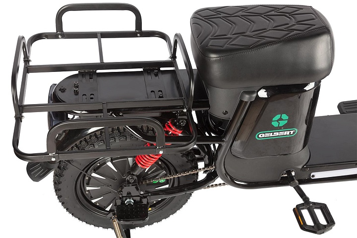Gelbert Condor 2 предлагает комфортную посадку благодаря удобному широкому сиденью. Большой металлический багажник с креплениями идеально подходит для курьерского рюкзака, что делает его практичным выбором для перевозки грузов или пассажиров.