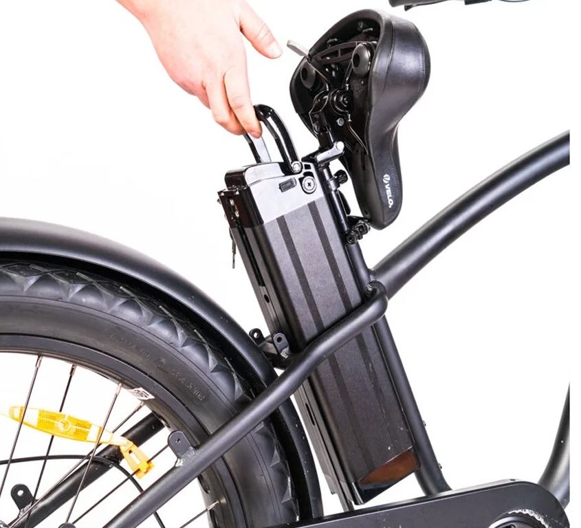 В заднем колесе расположен надёжный редукторный мотор Bafang. Он не подвержен перегреву, благодаря чему имеет практически неограниченный ресурс. Мощности 750 Вт вполне достаточно для динамичного разгона до максимальной скорости, которая составляет 45 км/ч.Литий-ионный аккумулятор электровелосипеда разместился сразу за подседельной трубой. Несмотря на то, что он расположен внутри рамы, его можно легко извлечь - например, чтобы занести домой и поставить на зарядку. Для этого достаточно нажать на рычаг, расположенный под седлом, а затем просто откинуть седло и поднять аккумулятор за ручку. Установка батареи на место осуществляется так же легко, благодаря направляющим на раме. Контроллер управления двигателем разместился внутри рамы под батареей, так что он не заметен и надёжно защищён.