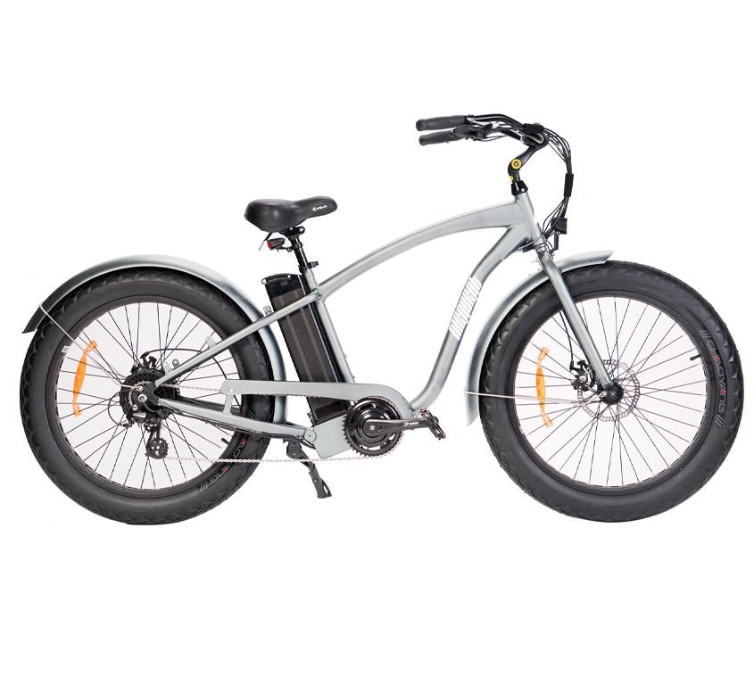 Электровелосипед "Медведь Cruise" имеет брутальный внешний вид и спректирован в стиле чоппера - об этом говорит форма рамы, изгибы руля, чёрный цвет и широкие покрышки. Он имеет удобную посадку и отлично подходит для передвижения по городу. Кроме того, регулируемый вынос руля позволяет настроить велосипед "под себя".Несмотря на отсутствие амортизаторов, велосипед катится очень мягко - по сути, роль амортизаторов играют широкие покрышки, содержащие значительный объём воздуха. Из навесного оборудования стоит отметить задний переключатель Shimano Altus на 7 скоростей и надёжные механические дисковые тормоза Tektro Aries. Для комфортной езды после дождя, на фэтбайке установлены полноразмерные крылья, защищающие велосипедиста от брызг. Благодаря наличию подножки, велосипед всегда можно поставить там, где это удобно, не прислоняя и не опуская на землю.