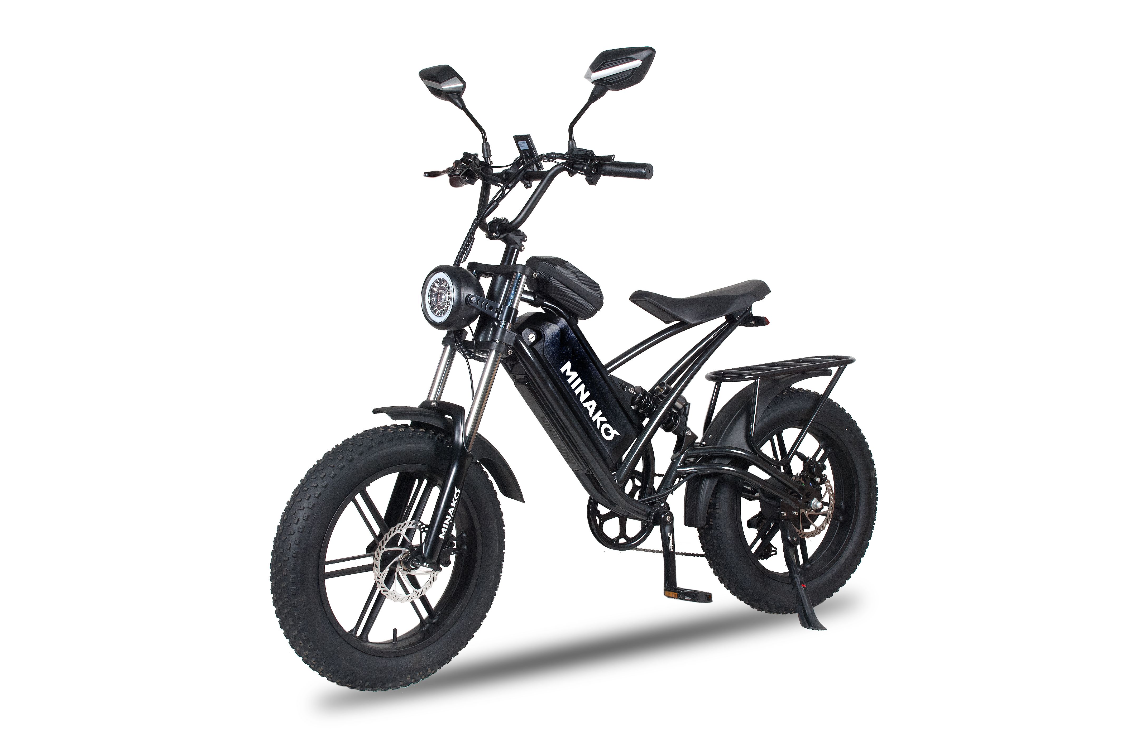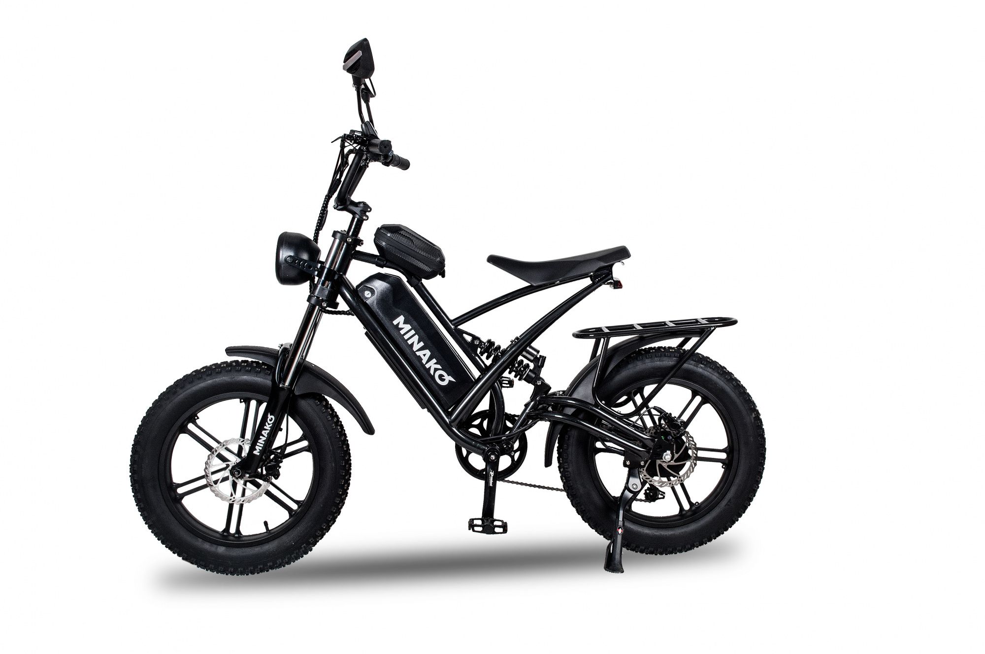 Широкие колеса и качественные шины обеспечивают отличное сцепление и устойчивость на различных покрытиях, что делает Minako FOX универсальным для городских и загородных поездок. Этот электрофэтбайк – отличный выбор для тех, кто ценит стиль, комфорт и производительность