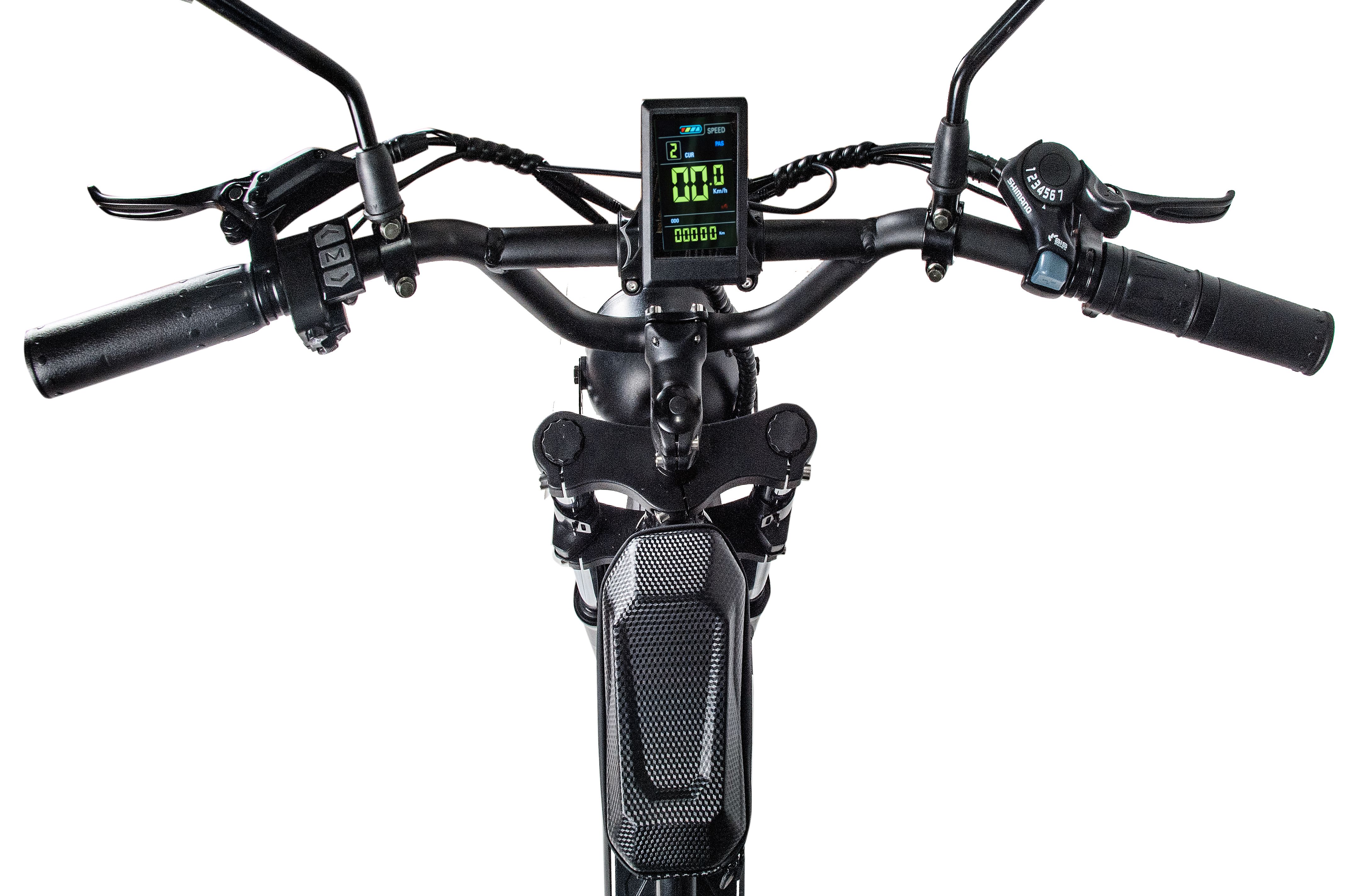 На руле находится небольшой бардачок, в который удобно помещаются мелкие вещи, такие как телефон или кошелек. Также на руле расположены тормозные рычаги, информационный дисплей и кнопки управления подсветкой, что делает управление велосипедом простым и интуитивно понятным.